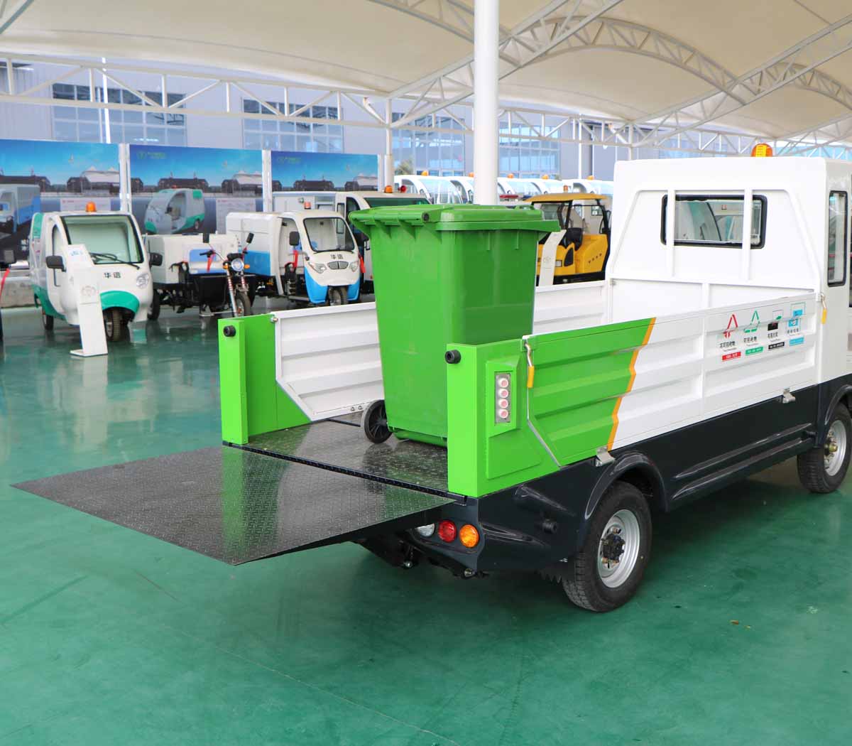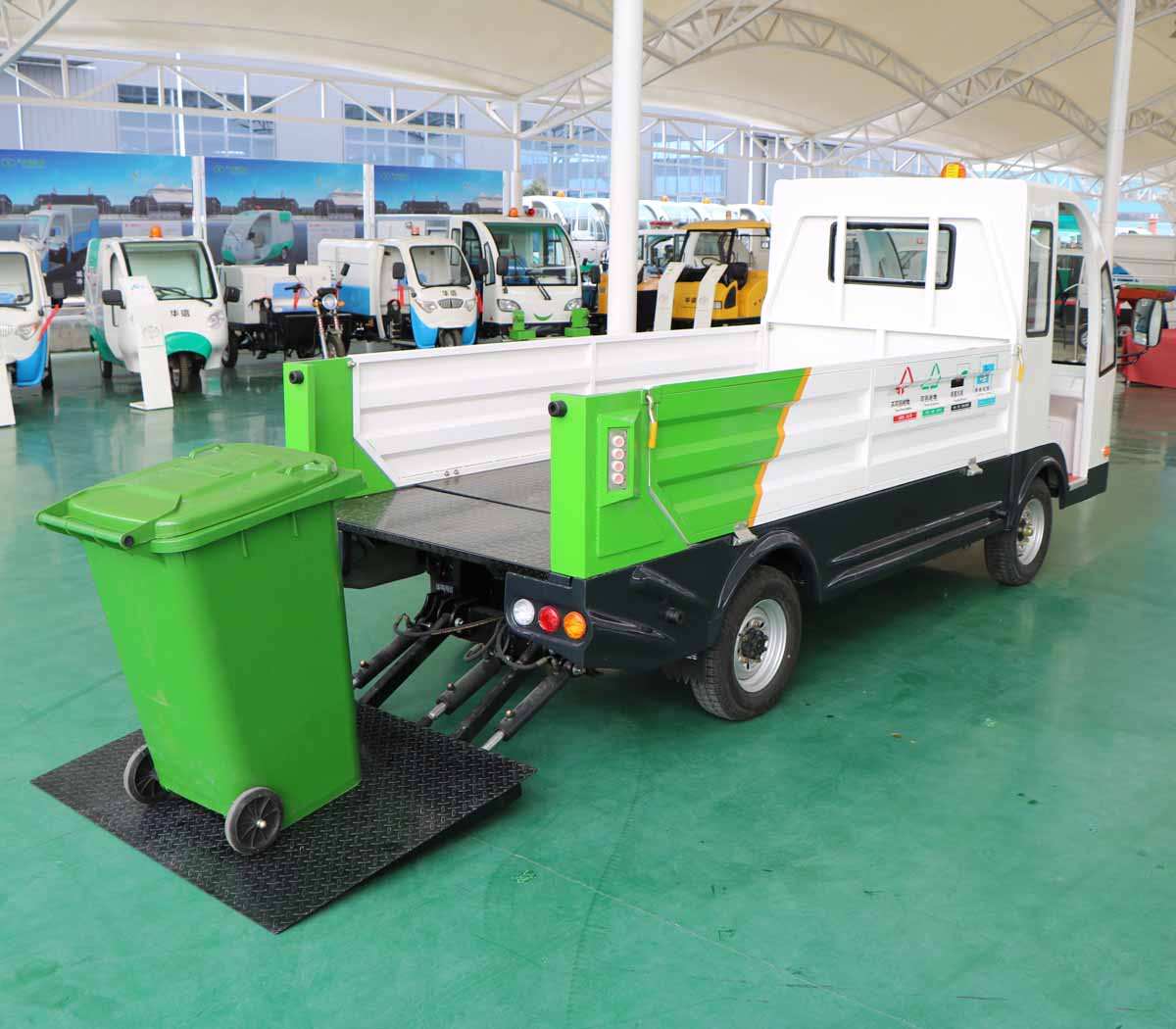 7、车厢地板采用防滑花纹钢板,可防止垃圾桶在运输与转运过程中打滑。